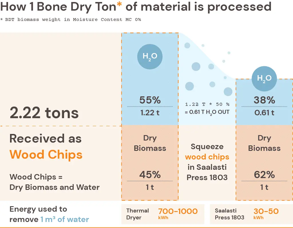 - Water removed mechanically: ~0.61 tonnes of water squeezed out per BDT of wood chips