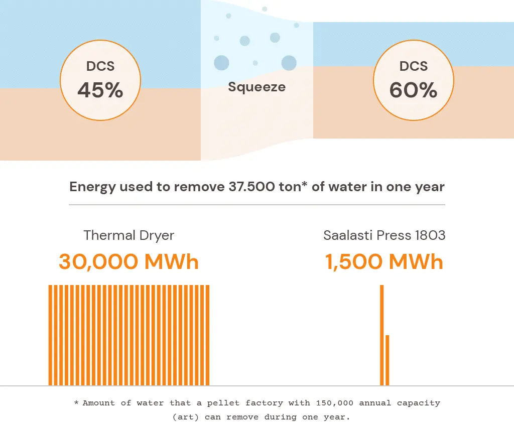 - Less energy consumption → The more moisture you need to remove, the more heat and energy are required. For comparison, a thermal dryer requires 700-1000 kWh to remove 1m3 of water, whereas the Saalasti Press 1803 uses only 30-50 kWh.